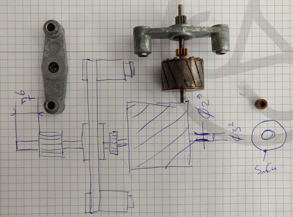 Wat was er ook al weer aan de hand? Nou, het eindlager van de rotating flipper motor was totaal versleten. Het ding was helemaal ovaal geworden, en bovendien was het asje ook 0,3 mm kwijt aan slijtage, en daardoor sleepte de rotor langs de stator. Niet lekker.