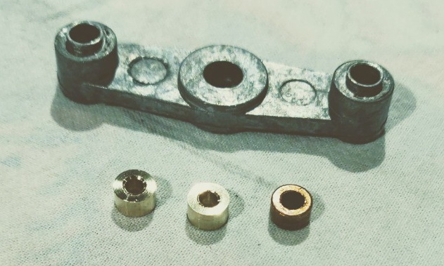 Anyway, gelukkig had Cor nog een staaf messing staan, en hij was zo vriendelijk om een stukje daarvan te gebruiken. Het draaien ging voorspoedig, en na 2 uur draaien en ouwehoeren over onze hobbies over en weer lagen ze daar: twee spiksplinternieuwe lagertjes! Eenmaal thuisgekomen het afgesleten asje van de rotor in de boormachine gespannen, en over een vijltje laten draaien tot de slijtage was verdwenen en het de juiste diameter (2,9 mm) had voor het nieuwe lagertje.