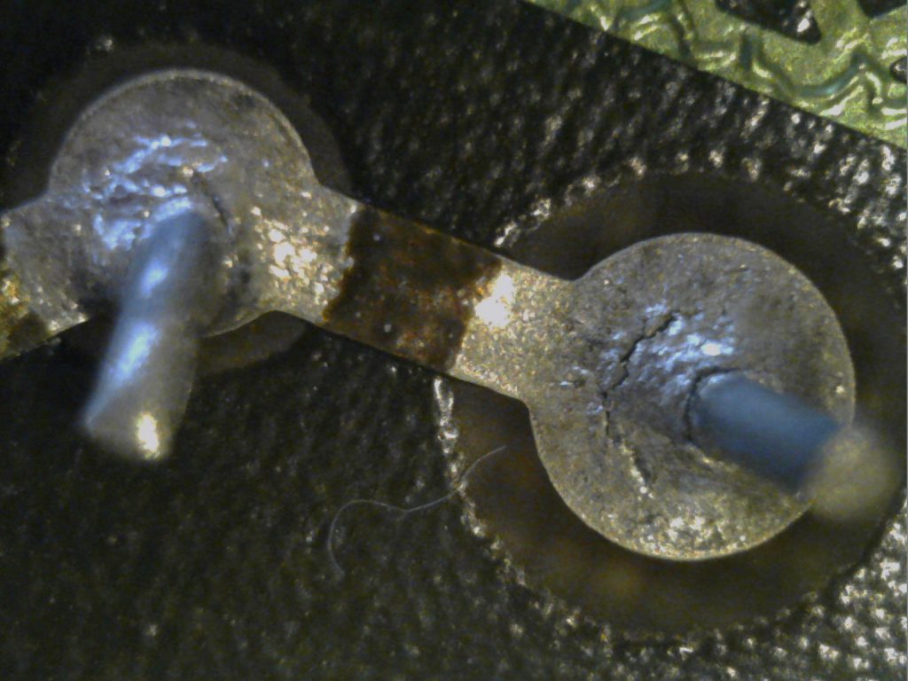 En ja hoor… bij het bekijken van de Display Controller ontwaar ik de eerste scheurtjes in enkele soldeer-eilandjes van grote weerstanden. Gezien de afmetingen kunnen ze een kleine 5 Watt dissiperen, en dat betekent behoorlijk wat warmte (100 graden kan zo maar). En daarna koelen. En weer opwarmen, en weer koelen… enfin, je snapt het. Daardoor zet het uit, en krimpt het weer, en dat betekent mechanische stress op de soldeerverbindingen waardoor scheurtjes ontstaan. Door die scheurtjes geleidt het soldeer minder goed, en gaat op zichzelf als weerstand fungeren. Met nog meer warmte tot gevolg. Deze neerwaartse spiraal eindigt meestal in tranen.
