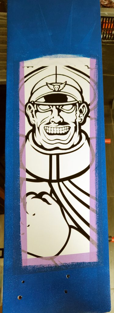 Dan de Frustration: In de afgelopen week ben ik verder gegaan met het verfwerk van de zijkant van de lichtkast. De rechterkant had ik al eens opnieuw gedaan omdat de grondverf ondanks grondige voorbehandeling losliet (bedankt, Flexa!). Die nieuwe laag grondverf van (niet lachen..) Action hecht echt als een tierelier! De linkerkant leek nog wel te redden. Maar na de witte, blauwe, zwarte, en gele verflaag was ik vandeweek toe aan oranje en…. toen trok ik met het loshalen van het sjabloon geel en zwarte verf (#@&**!!) mee……zucht. Dilemma: repareren of opnieuw doen?